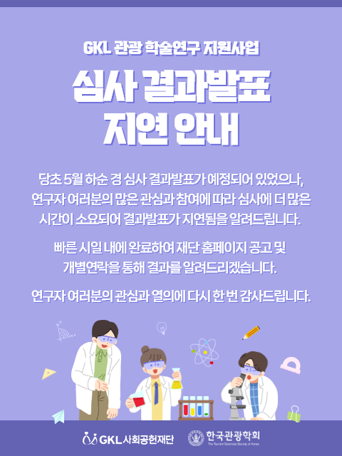 [(사)한국관광학회] GKL 관광 학술연구 지원사업 심사 결과발표 지연 안내